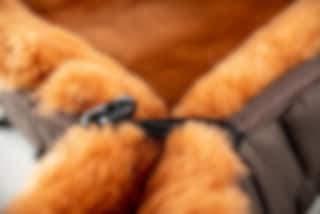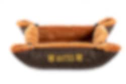 Härligt mjuk och mysig hundbädd i brun quilt fodrad med finaste fårskinn i cognac, från EA Mattes.