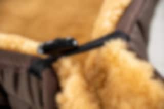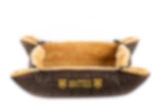 Superfin, mjuk och mysig hundbädd i brun quilt med honeyfärgat fårskinn, från EA Mattes.