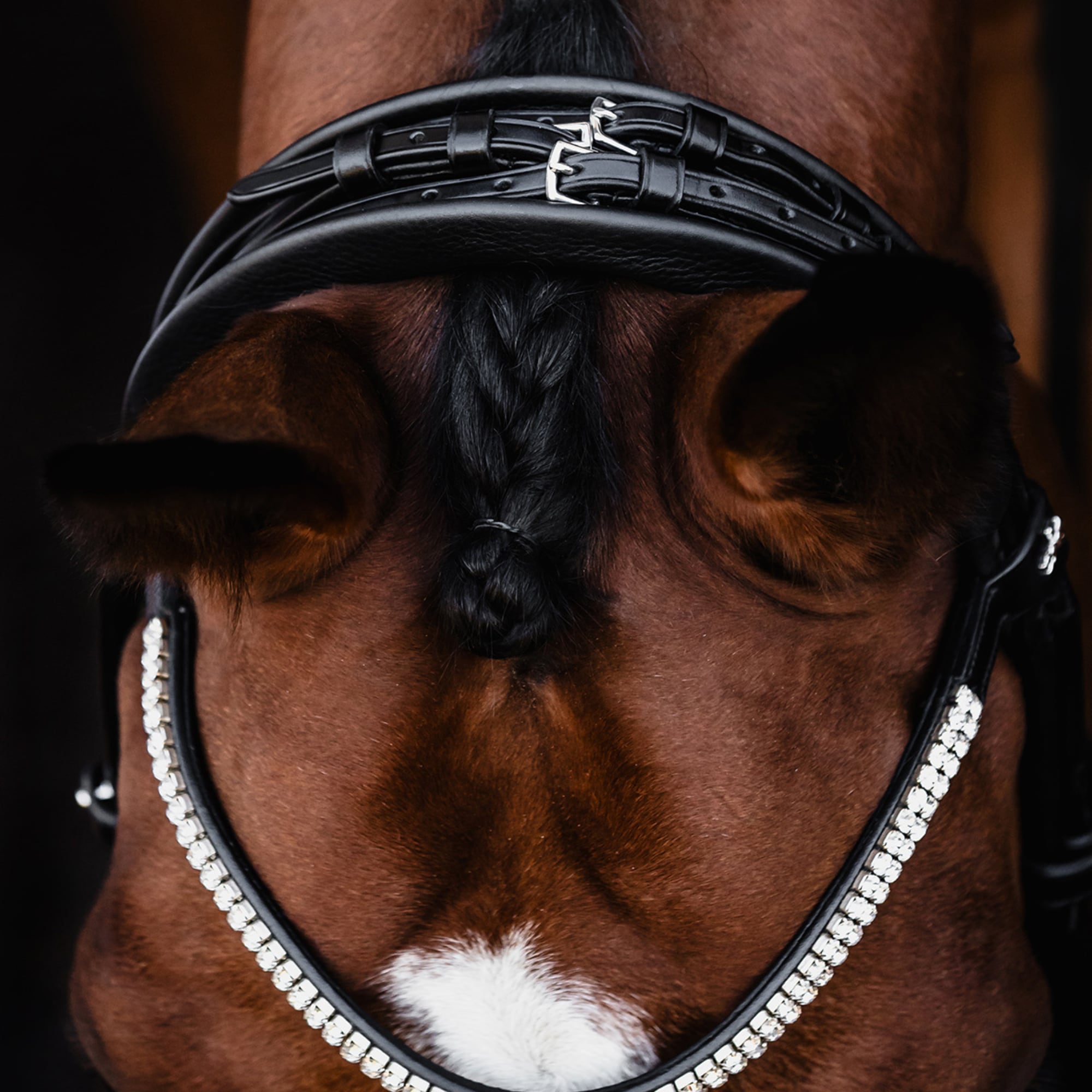 Kandaret Bella Rose i svart från Isabell Werths exklusiva kollektion med Schockemöhle Sports är ett anatomiskt kandar med rundsydda sidostycken, ett innovativt nackstycke med spännen i nacken, nosgrimma med specialanatomisk vaddering, smalt pannband med två rader kristaller och nickelfria spännen.