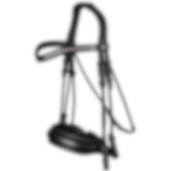 Vackert och funktionellt rundsytt svart kandar med svartfodrad bred anatomisk nosgrimma från Dyón Dressage Collection.