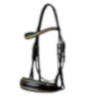 Fantastiskt vackert svart Comfort XS kandar med clinker pannband, guld piping på nosgrimma och mässingsspännen. Kandaret kommer från Sattlerei Otto Schumacher. Full size.