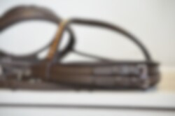 Detta är ett brunt Munchen Feel Good rundsytt träns med det lite bredare välpaddade nackstycket som benämns just med Feel Good för att det har en mjukare anläggning mot hästens nacke. Nosgrimmanpå det här rundsydda tränset är 4,5 cm bred i modellen Cut back, vilket innebär att nosgrimman är tillbaka-skuren och därmed smalare vid sidorna där hästen har som minst plats vid bettet, nosgrimmans stängning är tillbakaknäppt.
