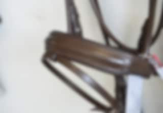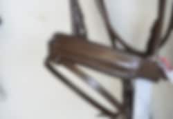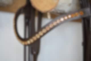 Vackert rundsytt brunt träns från Sattlerei Otto Schumacher med extra vackert pannband i olika nyanser av Topaz.