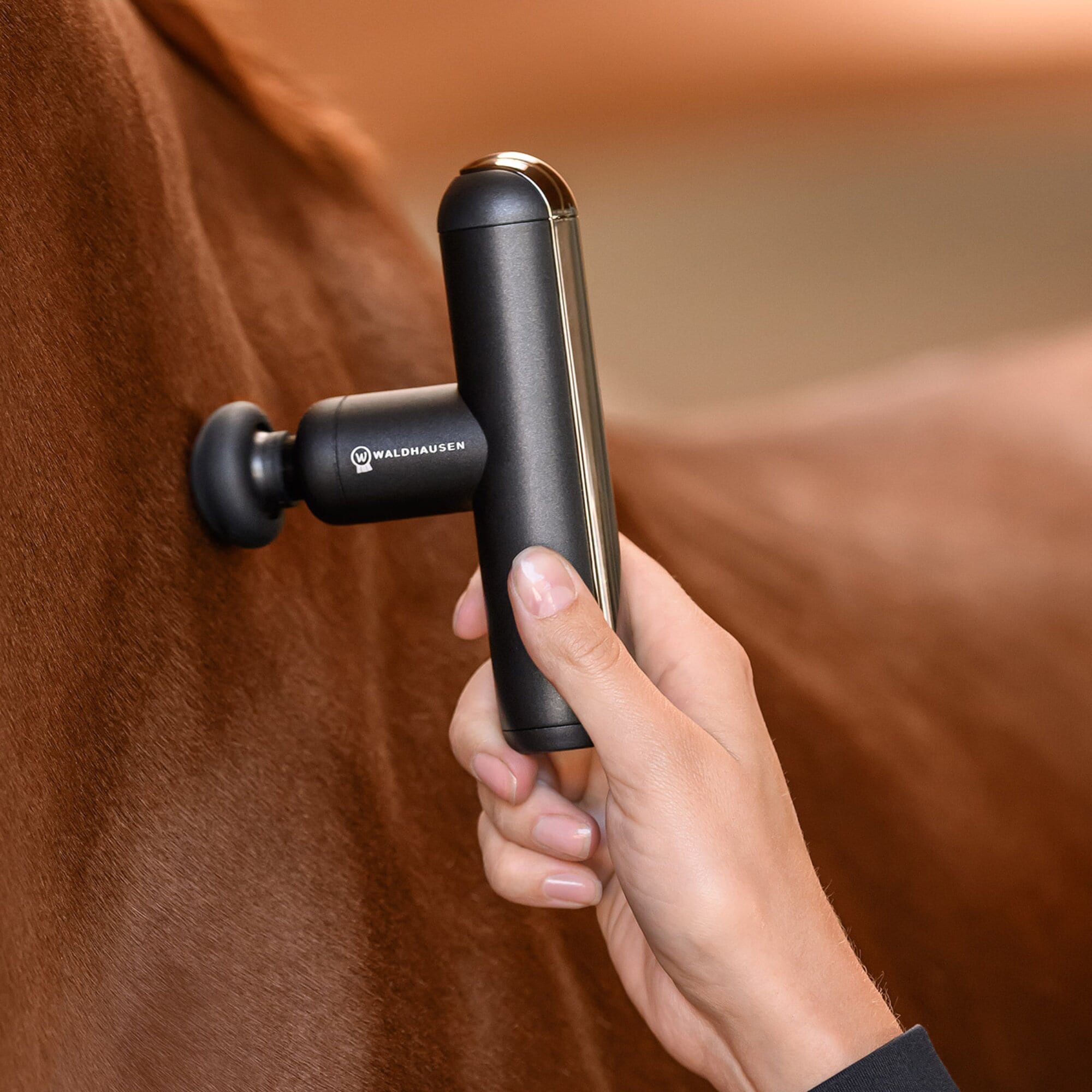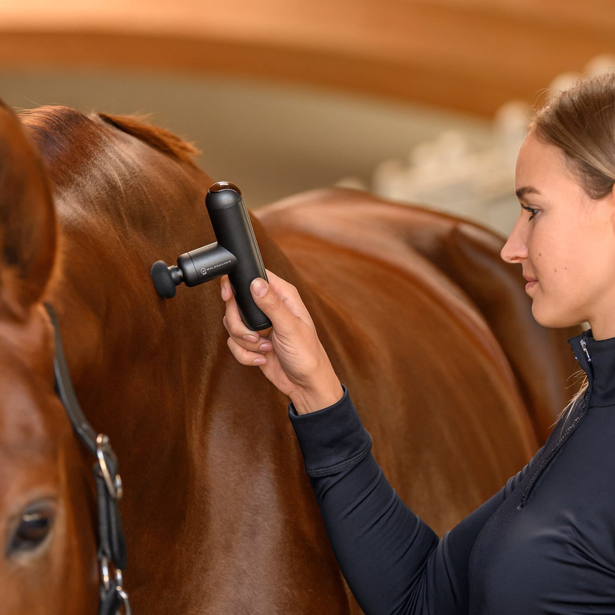 Denna smidiga massageapparat är särskilt utvecklad för användning på häst. Med fyra utbytbara silikonhuvuden och fem individuellt valbara vibrationsnivåer (1800/2100/2400/2700/3000 varv/min) kan massagen anpassas optimalt efter olika muskelgrupper och hästens känslighet.