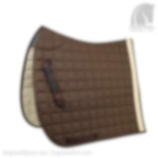 Det här är ett dressyrschabrak med rakt hörn med brunt kantband, sandfärgad passpoal, snurra i guld/creme/brun och guldsnurra.