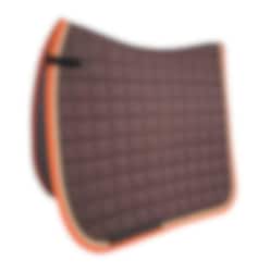 Här har ni ett dressyrschabrak i kombination av otroligt fina färger. Basen är i brunt och kantbandet i färgen rost, sedan har schabraket två passpoaler i ljusbrunt och sand.