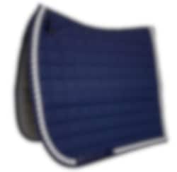 Dressyrschabraket har stor quiltning (5x5cm) och är förstärkt med mjuk teddy i manken för att förebygga skav. Dressyrschabraket från Mias RS är försedd med två snurror som löper längst hela schabraket, en i silver och en i marin/silver/pärlemo. Liksom alla dressyrschabrak från Mias RS håller detta hög kvalité och passform.