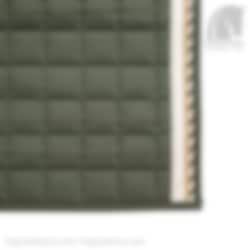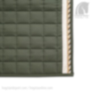 Dressyrschabraket har stor quiltning (5x5cm) och är förstärkt med mjuk teddy i manken för att förebygga skav. Schabraket är försett med ett platt band i sand, följt av en snurra i brun/vit/guld och en något tunnare snurra i guld. Kantband i ton-i-ton.