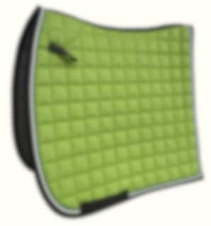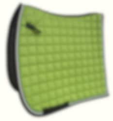 Pikantgrönt dressyrschabrak med svart kantband och två snurror i pärlemor samt grön. Stora quiltade rutor (5 cm) och 17" stort.