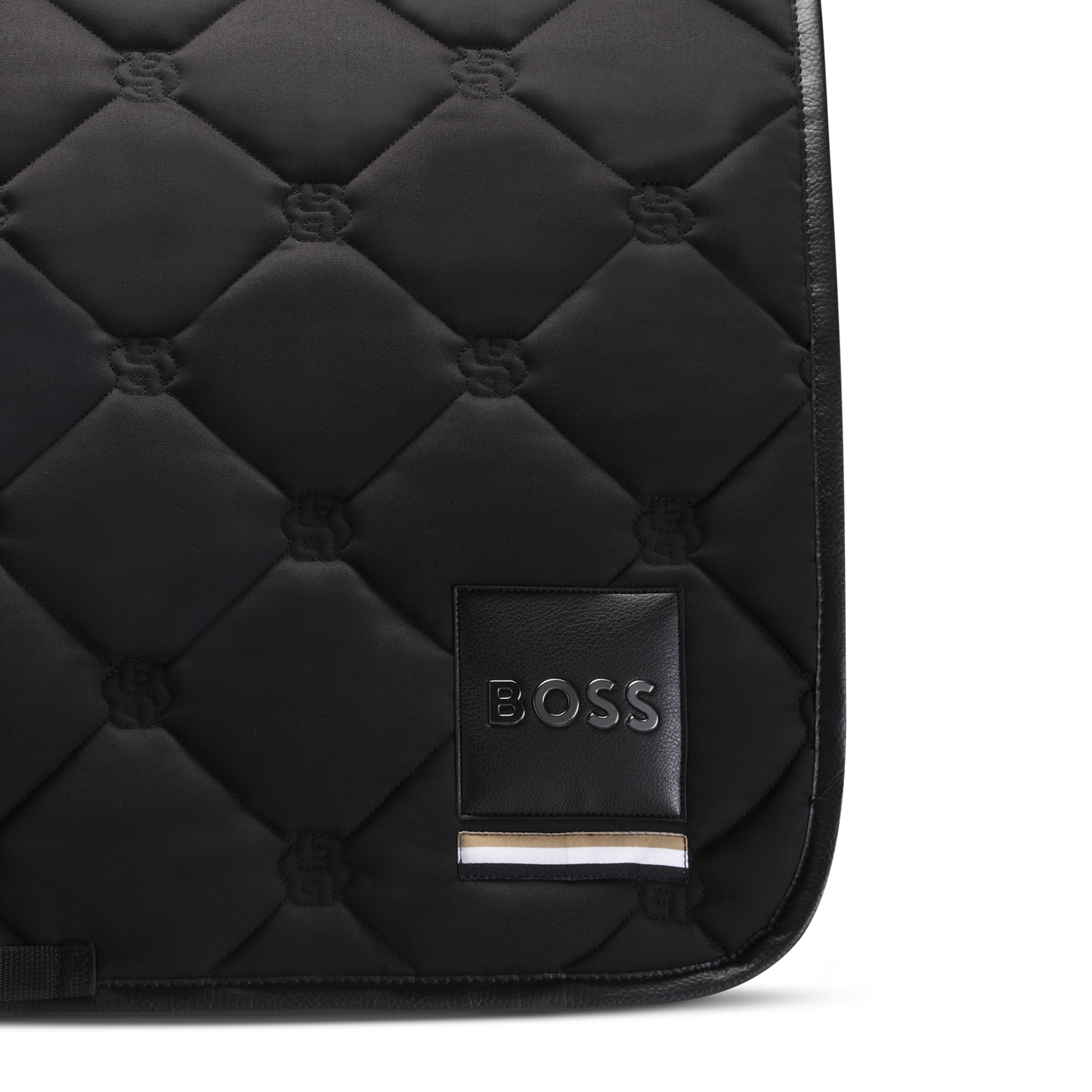 Elegant och stilrent dressyrschabrak från Boss Equestrian i glansigt tyg av hög kvalitet. Schabraket har subtil quiltning, en klassisk läderpatch med signaturränder och ett fint kantband i imitation läder.