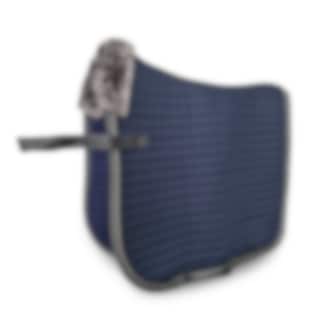 Show-Line Dressyrschabrak med faux fur vid manken från Bucas, marinblått med kontrasterande piping i grått.