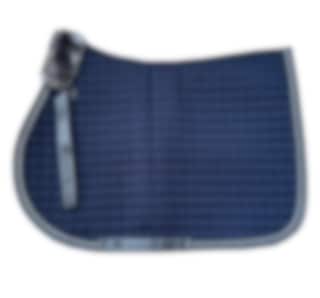 Show-Line Hoppschabrak med faux fur vid manken från Bucas, marinblått med kontrasterande piping i grått.