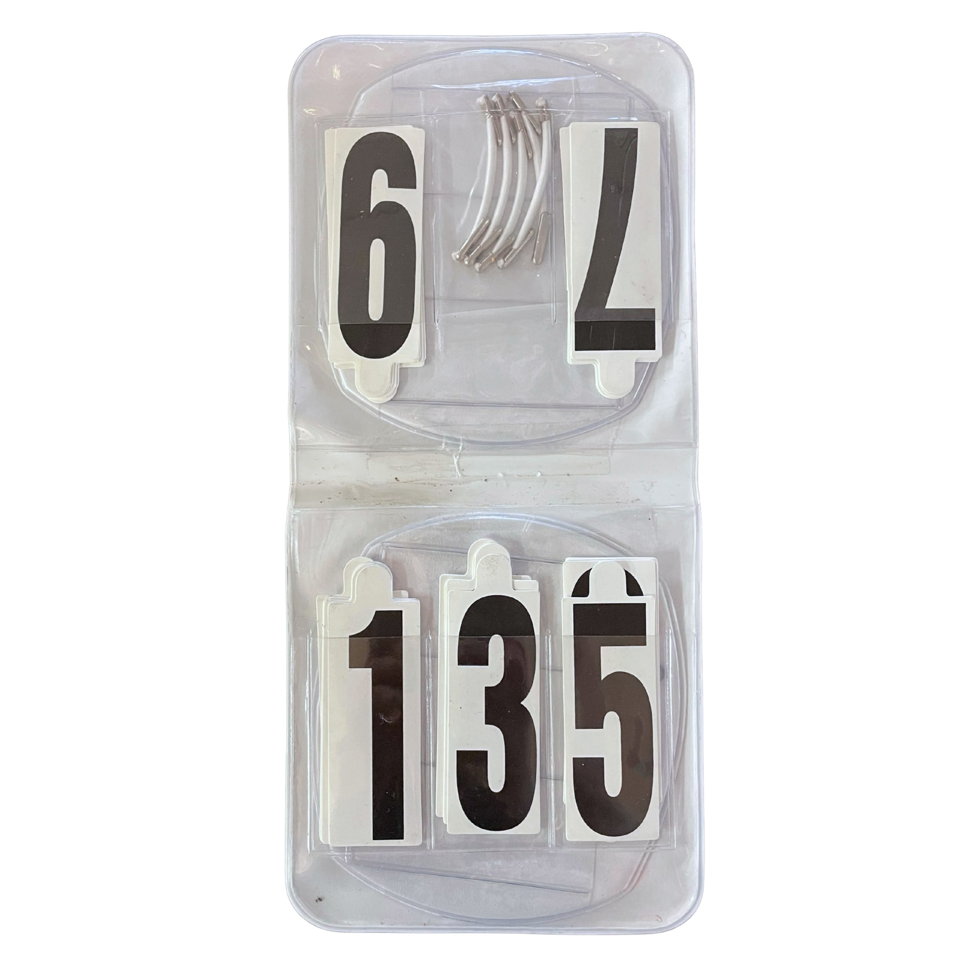 Kavalkades startnummerlappar säljs i set om par, sifferkombination från 1-999 med utbytbara siffror som placeras i en vit och transparent plastficka. nummerlappen kan sys fast på schabrak eller fästas på stigbygel/träns med knäppen som medföljer.