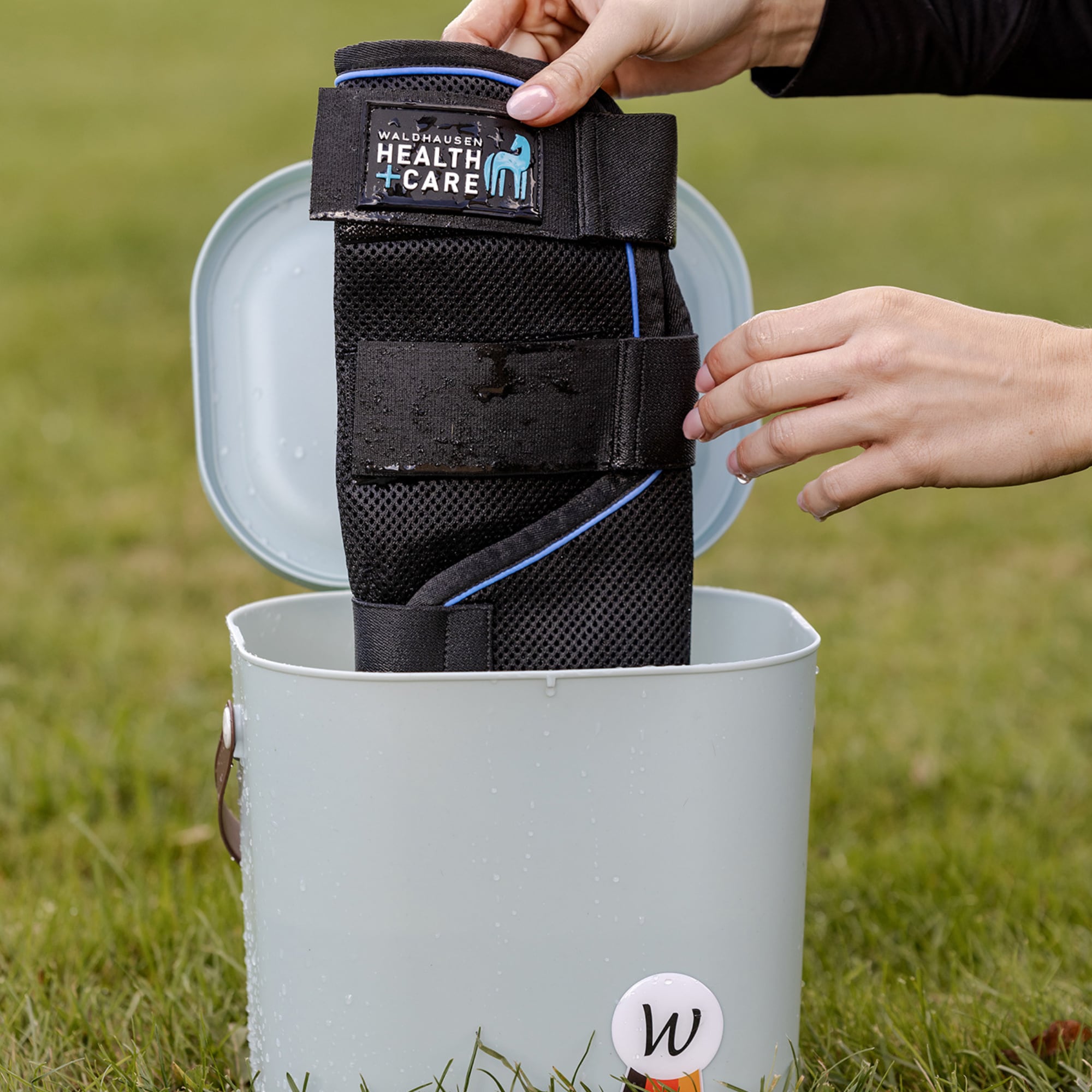 Skydden är enkla att använda, lägg dem i en hink med vatten tills materialet är helt genomfuktat. Krama sedan ur överflödigt vatten och placera dem runt hästens ben.