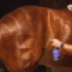 Spraya ett jämt lager pälsglans över hela hästen och rykta därefter med ryktborste och ryktskrapa. För ett extra glansigt resultat exempelvis inför tävling kan man använda en putshandske från EA Mattes.