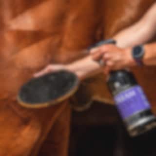 Spraya ett jämt lager pälsglans över hela hästen och rykta därefter med ryktborste och ryktskrapa. För ett extra glansigt resultat exempelvis inför tävling kan man använda en putshandske från EA Mattes.