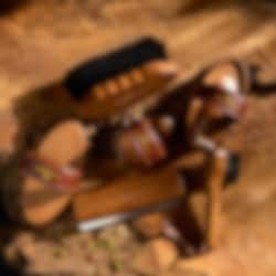 Handgjord hovkrats med ergonomiskt trähandtag, läderögla för enkel upphängning och hållbar rostfri krats-del med fasta borstar. Perfekt för att effektivt rengöra hästens hovar från smuts och stenar.