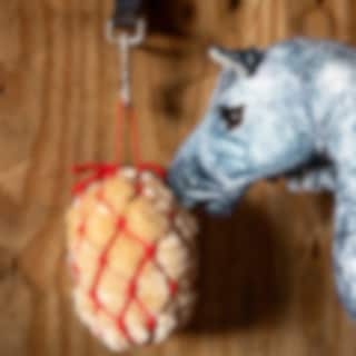 Den lilla höbalen är mjuk och fluffig, perfekt för fantasifull utfodring och lek. Hönätet har ett elastiskt öppningsband för enkel påfyllning och en kort upphängningsögla som gör matningen säker och smidig.