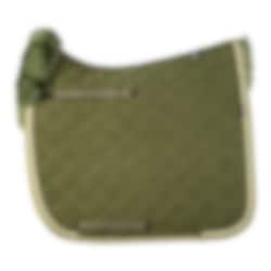 Fårskinnsschabraket är i oliv med fårskinn i oliv och två vackra passpoaler längs med schabrakets kant.