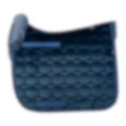 Fårskinnsschabraket är i marin med fårskinn i blått och en vacker passpoal längs med schabrakets kant.