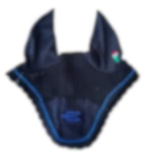 Equilines Flughuva Kim har en stilren design med E-logga i blå glitter samt Equiline-logo på huvans vänstra öra. Huvan skyddar hästens öron från insekter under sommaren och är en snygg detalj för träning och tävling.