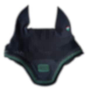Equilines Flughuva Dell har en stilren design med E-logga i grön med svart E samt Equiline-logo på huvans vänstra öra. Huvan skyddar hästens öron från insekter under sommaren och är en snygg detalj för träning och tävling.