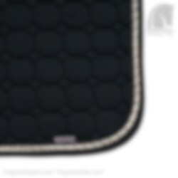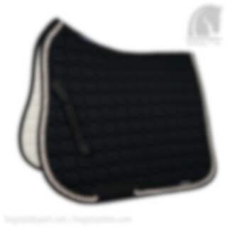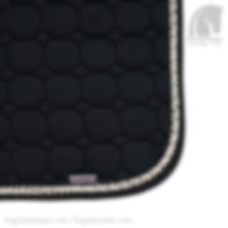 Detta svarta schabrak med svart kant och guld/sand passpoal blir både diskret och elegant på samma gång. Equilines schabrak är gjorda av finaste bomull, allergivänligt och behandlat för att förhindra att det krymper efter tvätt. Bra andningsförmåga, 900 g vadd, dubbelfodrat för att ge maximal andningsförmåga och stöt absorption. Ligger väldigt stadigt mellan sadeln och hästen. Vi har detta fantastiskt eleganta svarta dressyrschabrak hemma i stl full