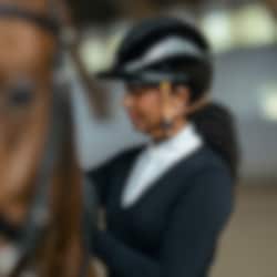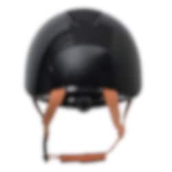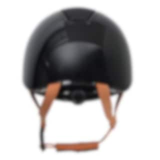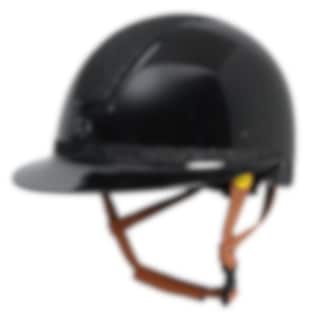 En elegant hjälm från Hansbo Sport med implementerat Multi-directional Impact Protection System "MIPS". Ridhjälmen har solskärm, sex ventilations-öppningar och ett hakband med trepunktsfästen i brunt syntetiskt läder med snabbspänne samt en mjuk tunnel för bästa bekvämlighet. Hjälmen har ett glansigt utförande med paneldetaljer i gnistrande glitter samt ett vackert glitterband runt skärmen.