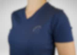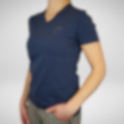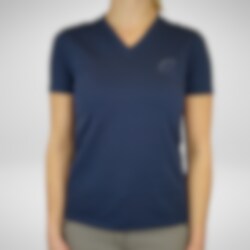 Stilren v-ringad t-shirt tillverkad i ett otroligt skönt material och i en stilren design. Materialet är en blandning av ekologisk bomull och elastan som är mycket mjukt och bekvämt att bära mot kroppen. Denna t-shirt är i marin med Hogsta logo med strassdetaljer på bröstet och en liten Hogsta logo baktill i nacken. En perfekt t-shirt att använda både i stallet och till vardags!