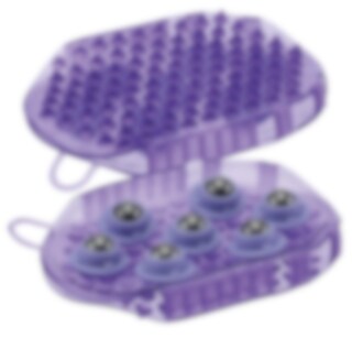 Lila massageskrapa med magnetiska massagehjul på ena sidan och små piggar på andra sidan.