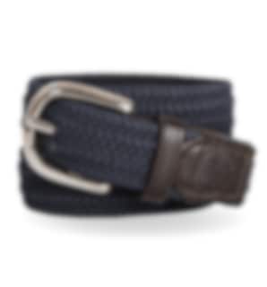 Superfint flätat, elastiskt mörkt marinblått skärp med snygga läderdetaljer och snyggt spänne.