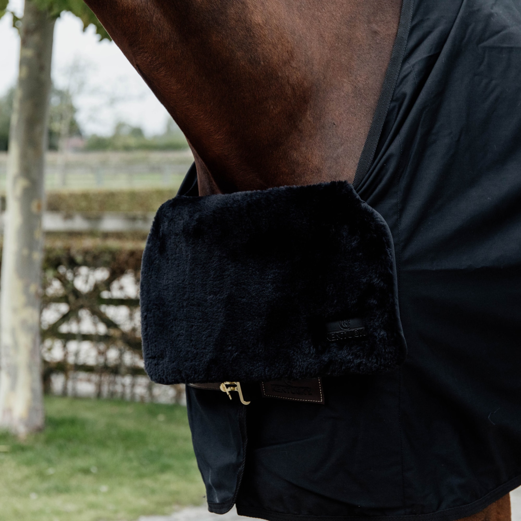 Kentuckys bogskydd i veganskt fårskinn skyddar hästens bogar mot skav från både innetäcken och utetäcken.