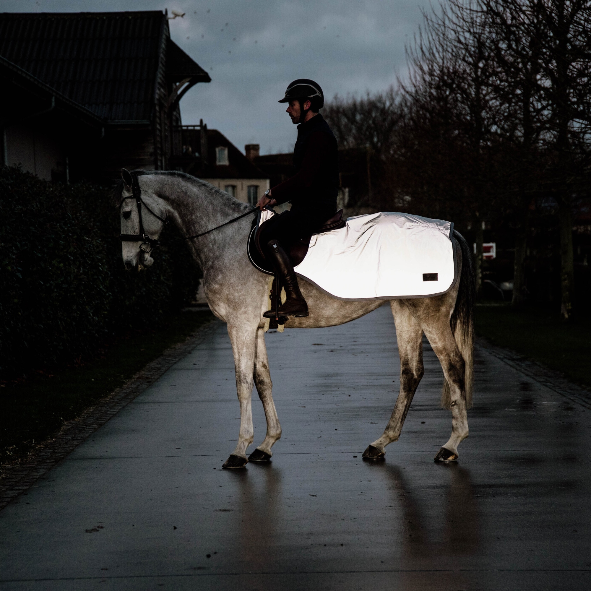 Ridtäcket är vattenavvisande och har ett mjukt fleecefoder som ger både värme och komfort under ridpasset. Den reflekterande ytan täcker hela täckets yta och ger maximal synlighet när ljus träffar.