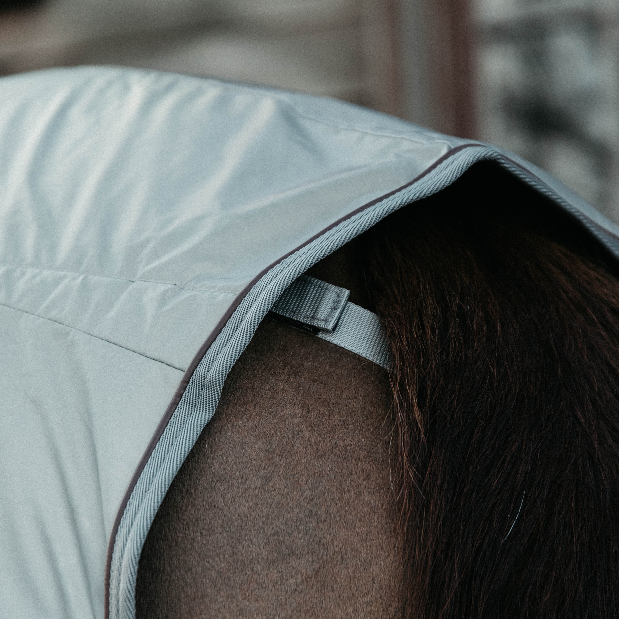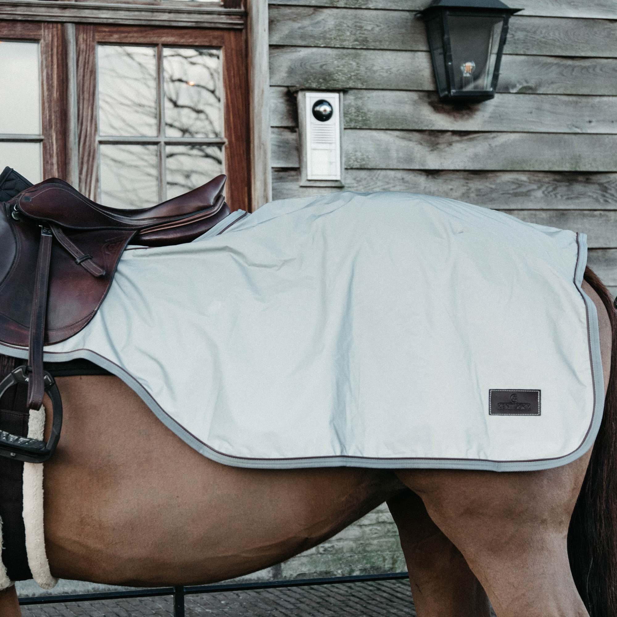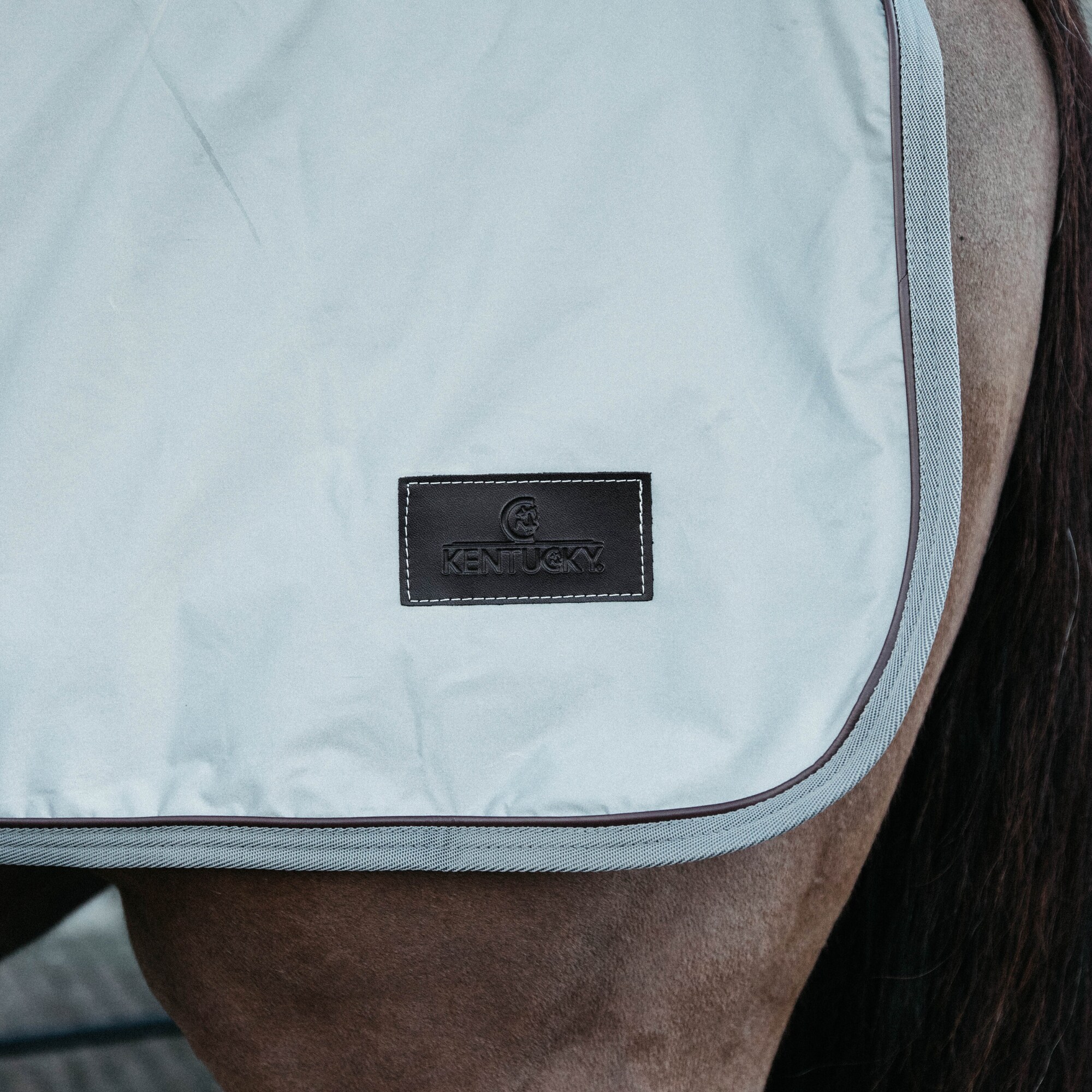 Kentuckys Riding Rug Reflective fästes enkelt framför sadeln med kardborre och har en svansrem som håller täcket på plats även under ridning.
