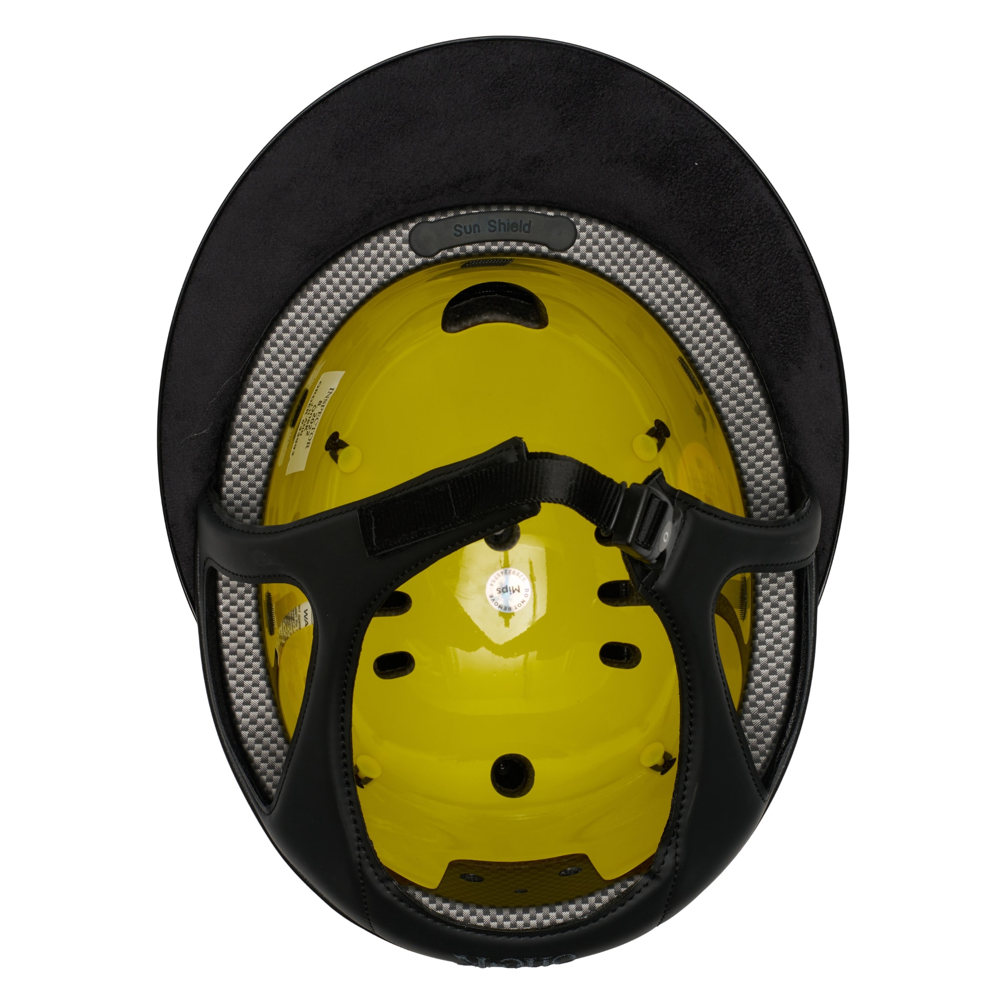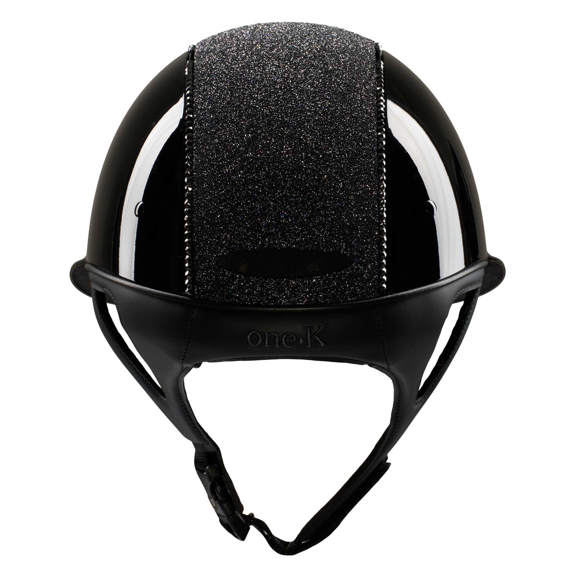 Denna OneK ridhjälm har en blank yta i Glossy med glittertopp och Swarovski-kristaller som ger ett exklusivt uttryck. Solskärmen ger ett effektivt skydd mot solljus och bidrar till hjälmens eleganta form.