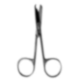 Krokformad sax som gör det enkelt att klippa upp sytråd eller gummiband vid borttagning av knoppar - utan risk att skada man eller pannlugg.