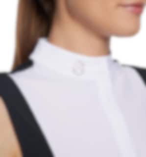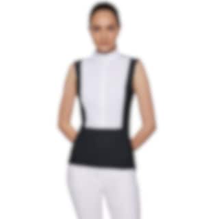 Yasmina är en ärmlös tävlingstopp perfekt för tävling, eller när du vill vara extra snygg på träning. Den är gjord i ett mycket bekvämt material som har god stretch, andas och är snabbtorkande. Framtill är tävlingströjan vit med dold dragkedja även kragen är i vitt med ett Samshield märke i Swarovskikristaller. Ryggen på tröjan är perforerad, vilket vackert bryter av mot framsidan.