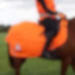 Reflexlländtäcket är i orange med reflexer på båda sidor av hästens bakdel.
