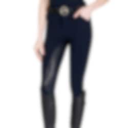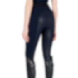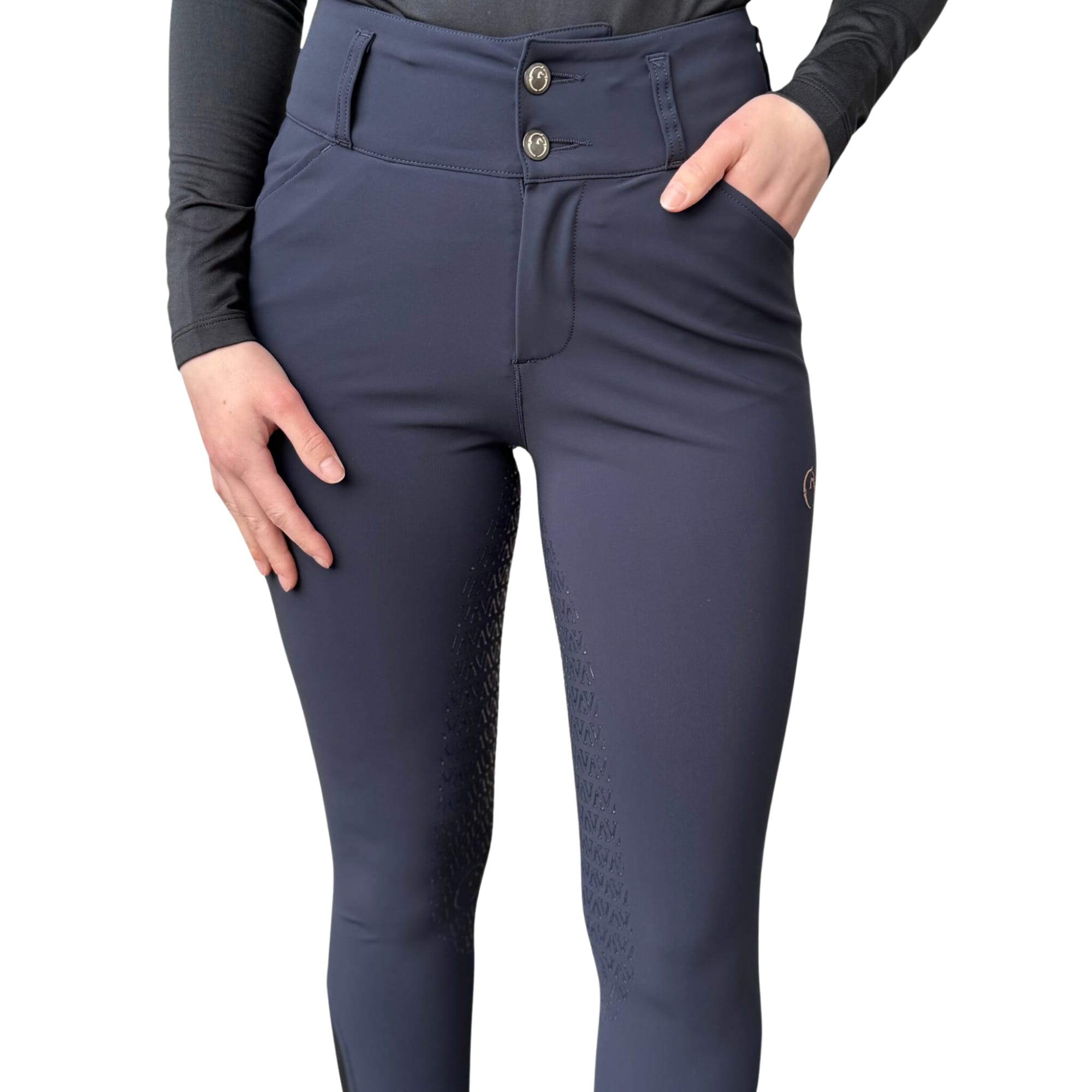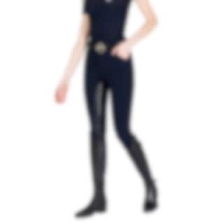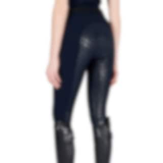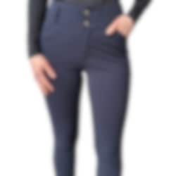 Den höga midjan med dubbla knappar ger en stabil och smickrande silhuett samtidigt som den ger stöd under ridning. Det tekniska stretchmaterialet formar sig efter kroppen och ger optimal rörelsefrihet utan att förlora sin struktur.