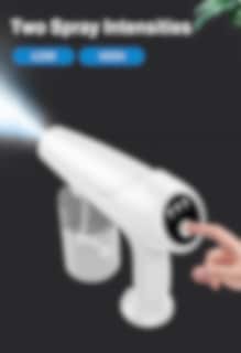 Nano Spray Machine väger endast 425 gram, behållaren rymmer 340 ml vätska och åtgången är 30 min vid högsta trycket.