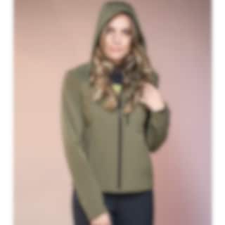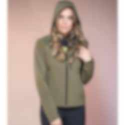 Saby Softshelljacka är skogsgrön med avtagbar huva, två fickor fram och en på bröstet.
