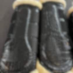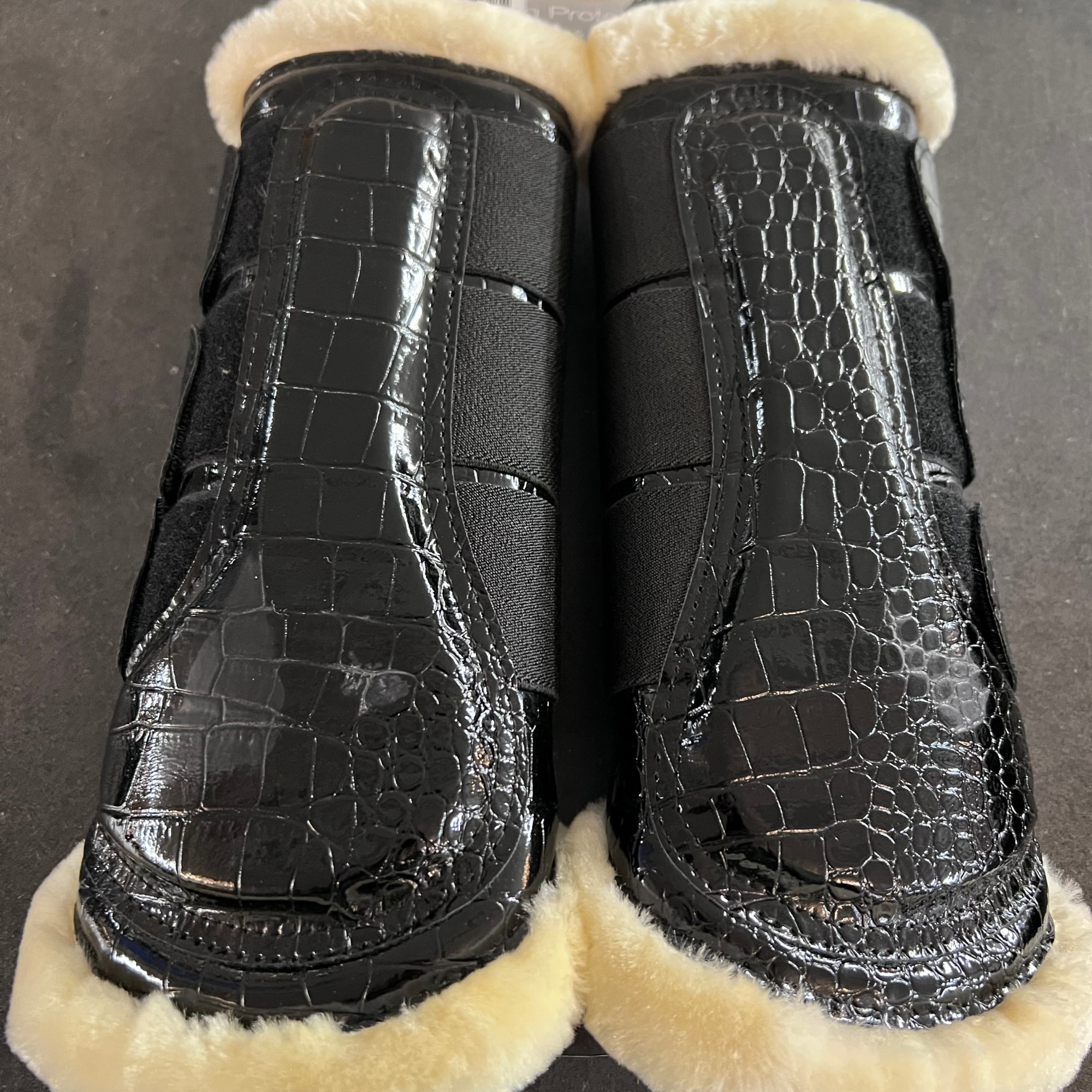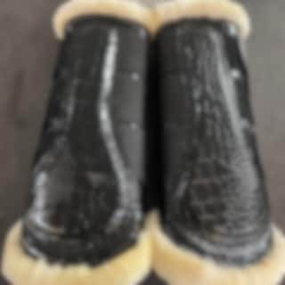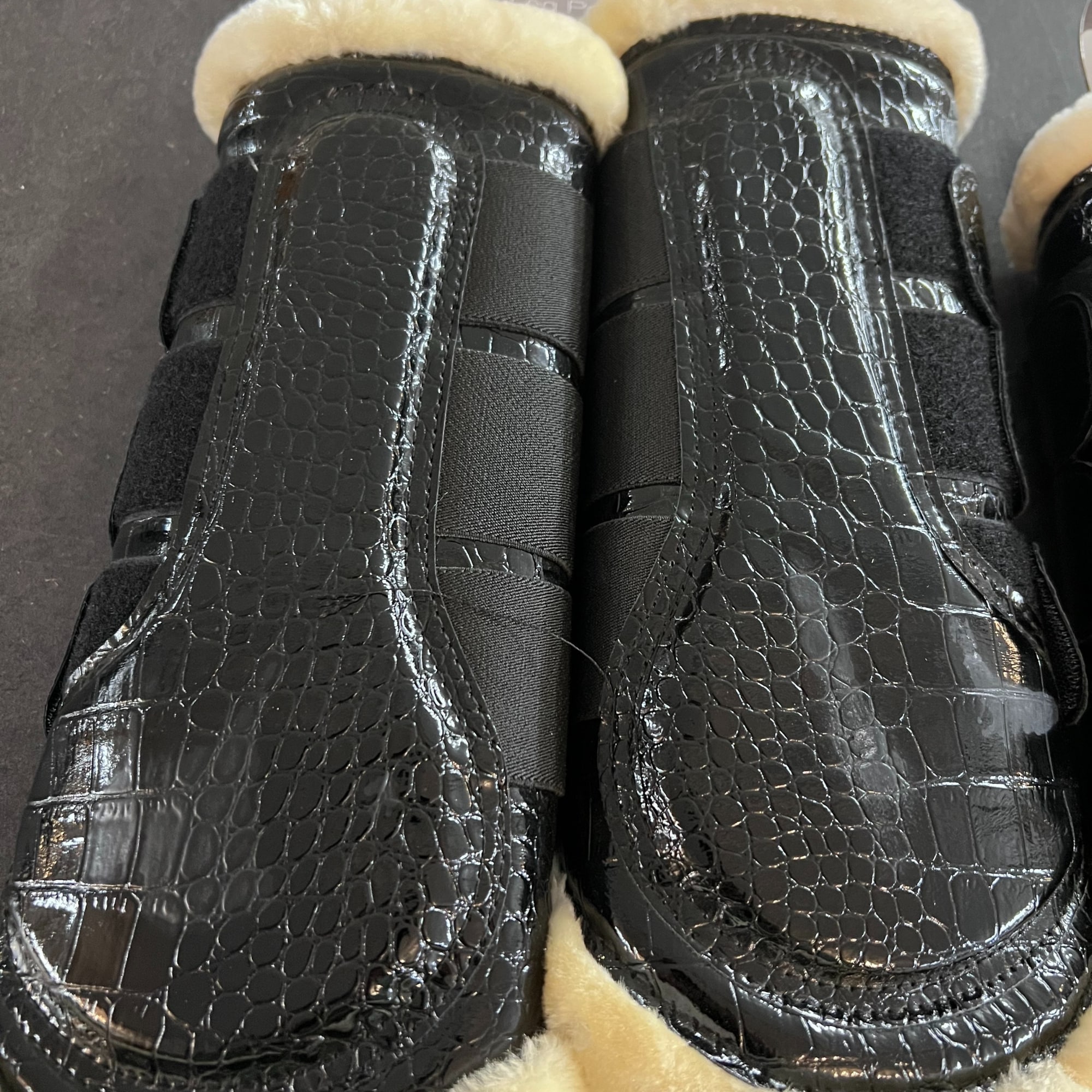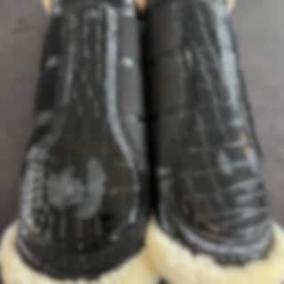Härligt mjuka benskydd i krokolackerat konstläder med mjuk fluffigt insida.