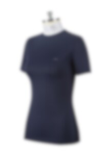 Detta är en tävlingsskjorta med kort ärm från italienska Animo. Tävlingsskjortan är i en snygg marinblå färg med vit krage som även har Animo i glittrande stenar skrivet runt kragen. Tävlingstoppen har även Animos diskreta logotyp på bröstet i stenar.