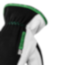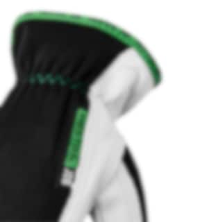 Kobolt från Hestra har en innerhand i tunt getskinn med förstärkta fingrar och tumme, handryggen är av ett stickat mjukt och följsamt textilmaterial (stretch polyester) och mudden har en insydd resår så att handsken sluter om på ett bra sätt.