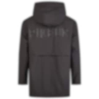 Regnponchon är tillverkad i ett fjäderlätt yttertyg med ventilerande meshfoder på insidan, har tejpade sömmar och en ledig, oversized passform med låg axelsöm. Modellen är lårlång och något längre baktill.