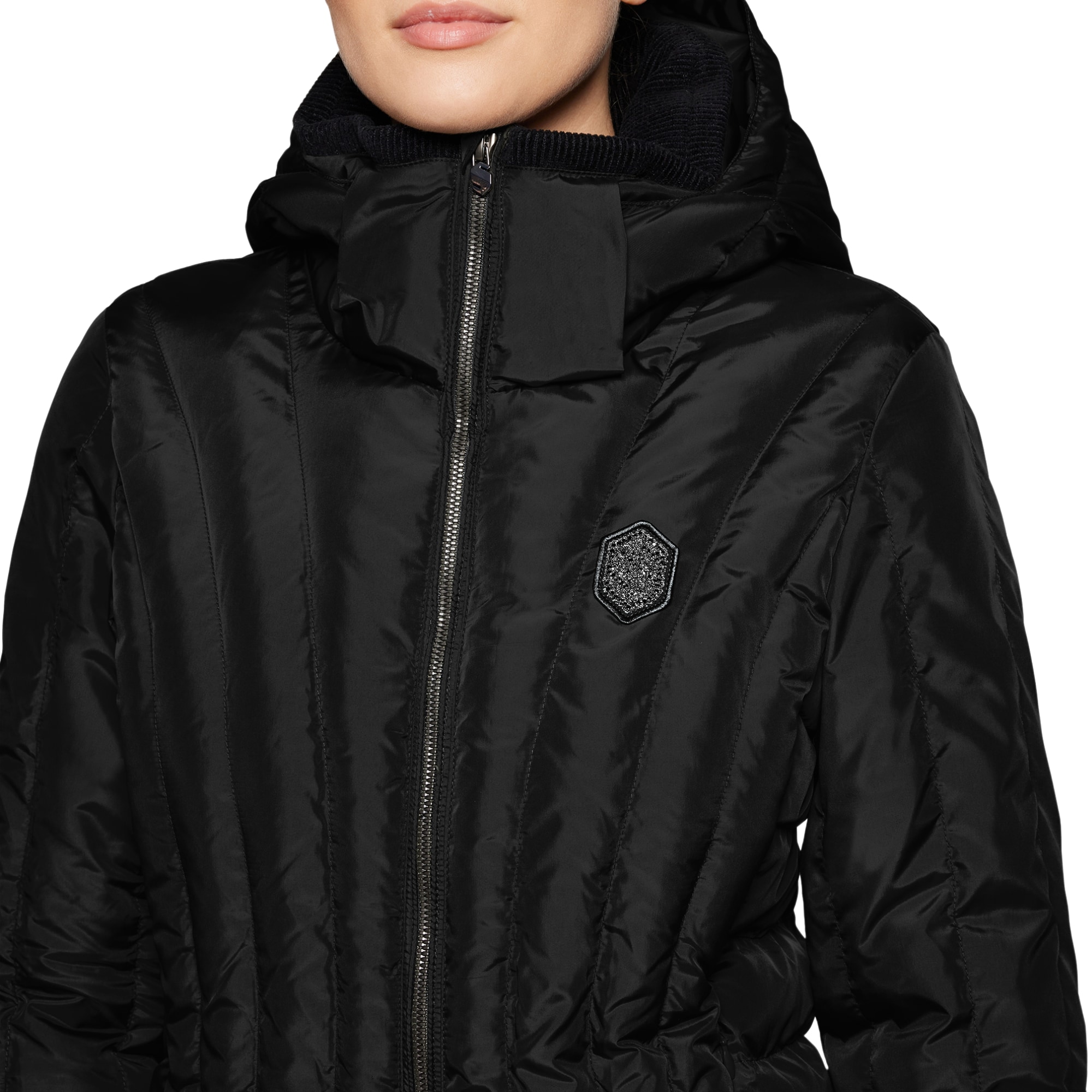 - Figursydd svart damjacka med avtagbar huva och hel dragkedja