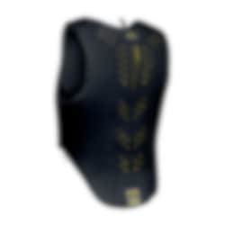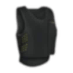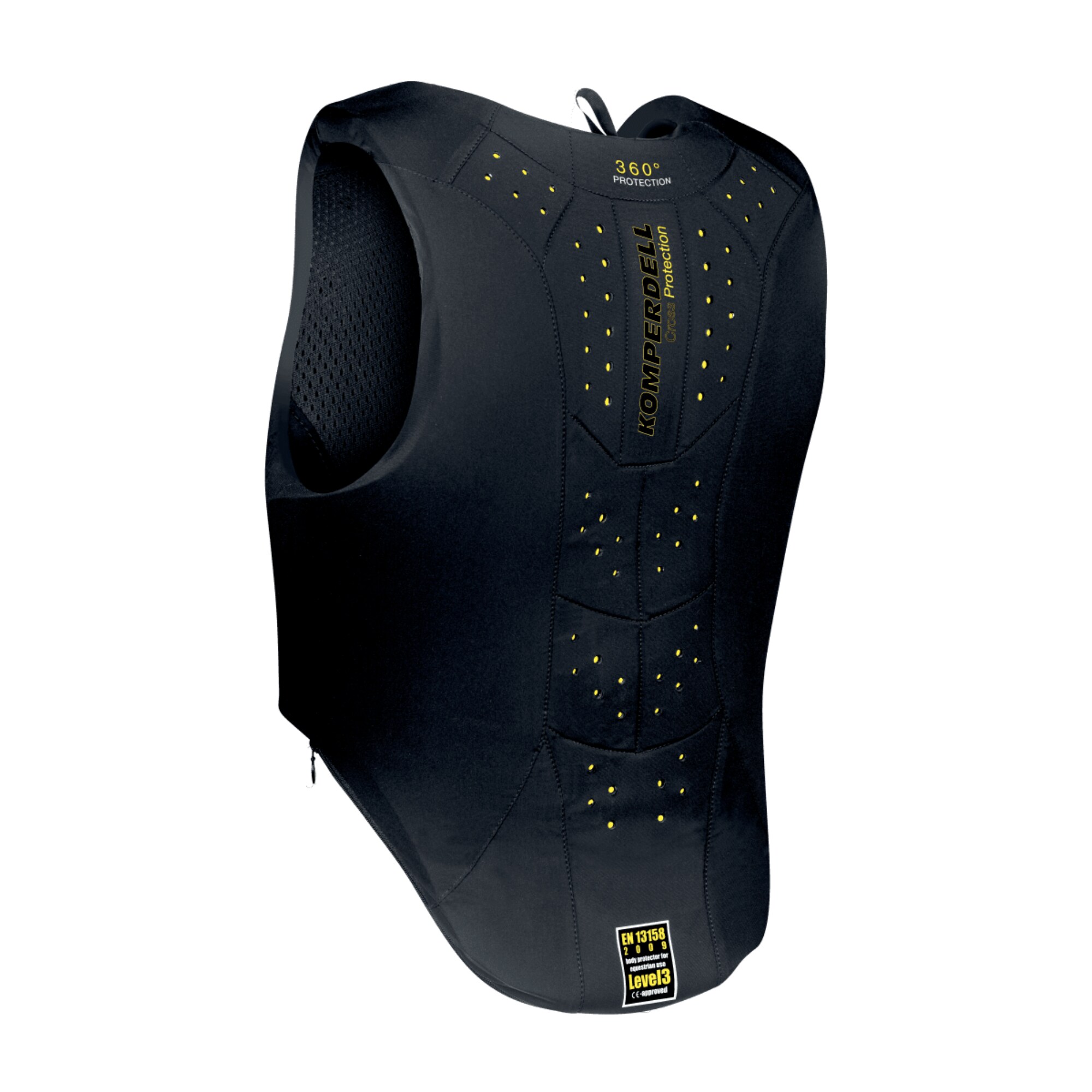 Den automatiska viddjusteringen i sidorna gör att västen sitter nära kroppen med en stabil passform utan att begränsa rörelserna i onödan. Den ergonomiska konstruktionen med flera lager följer ryttarens rörelser och ger ett jämnt skydd runt hela överkroppen.