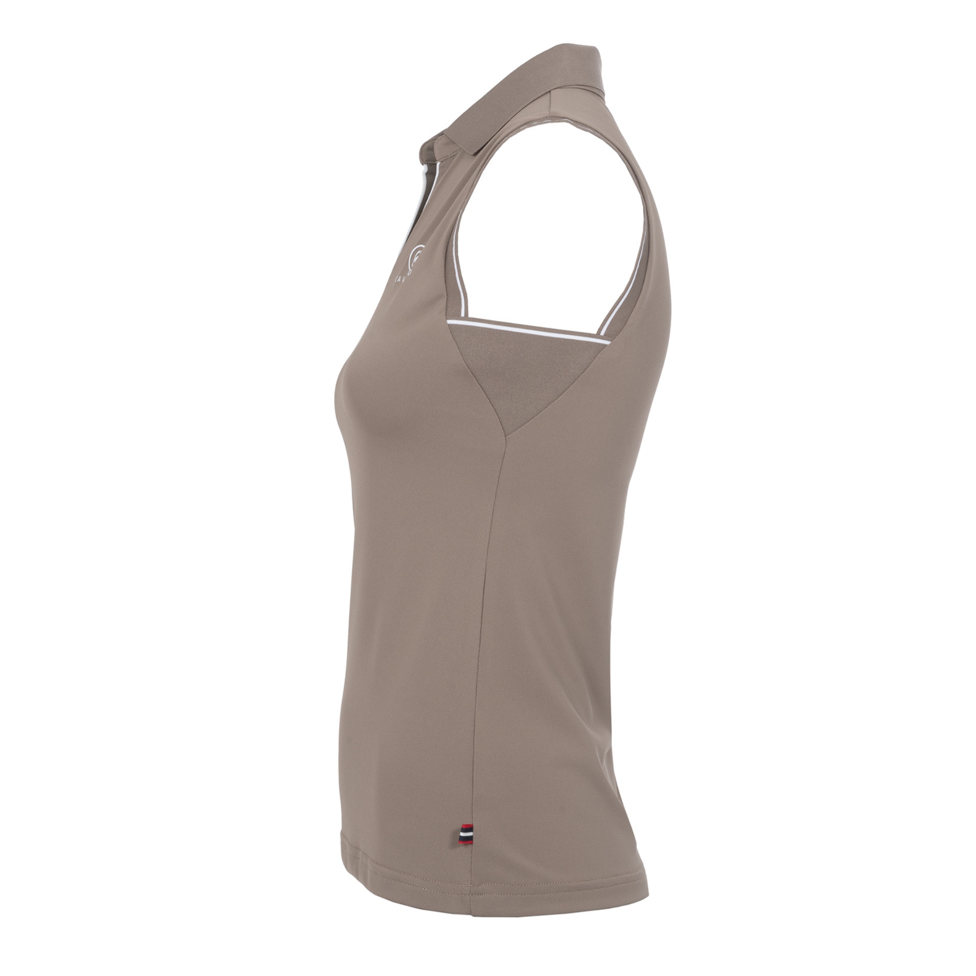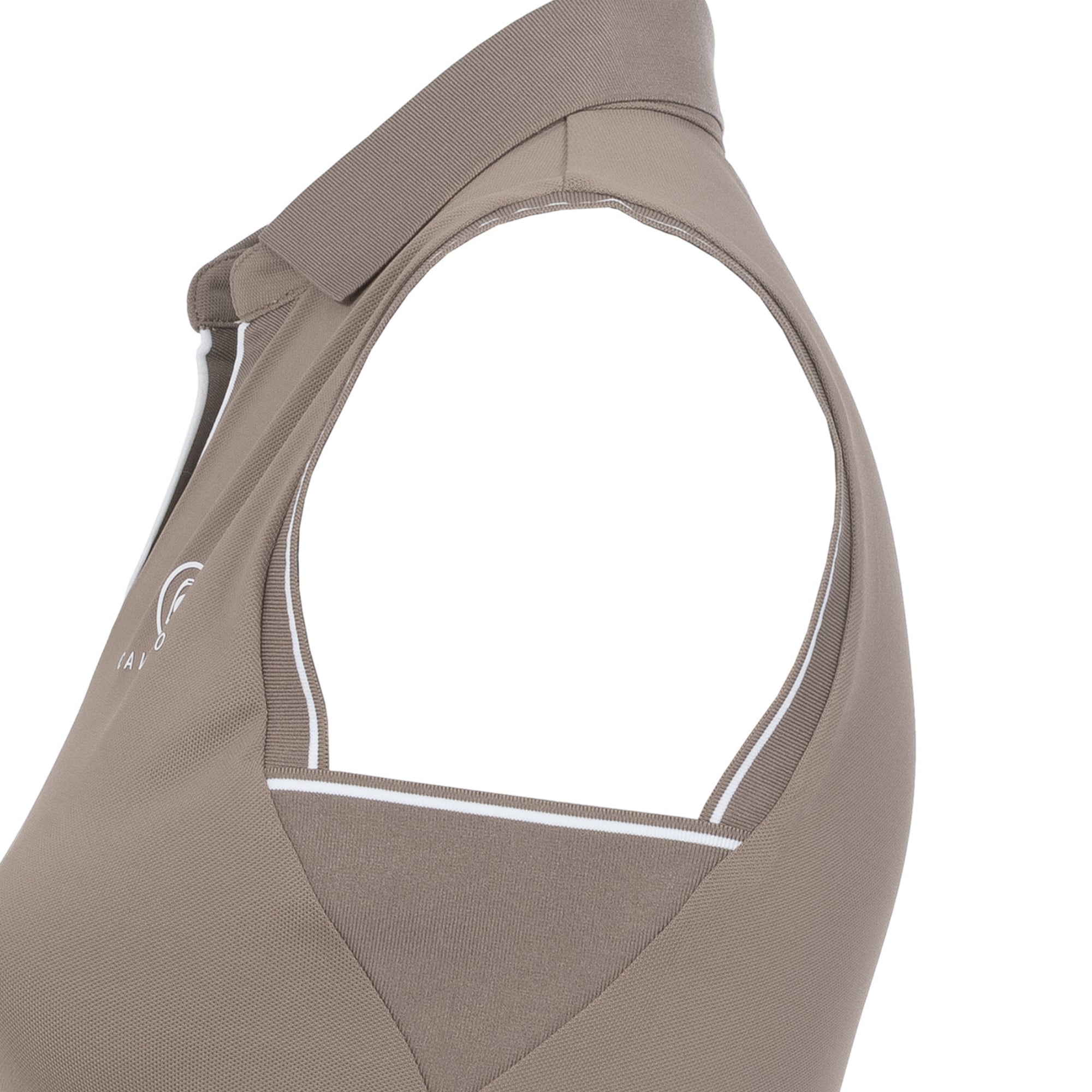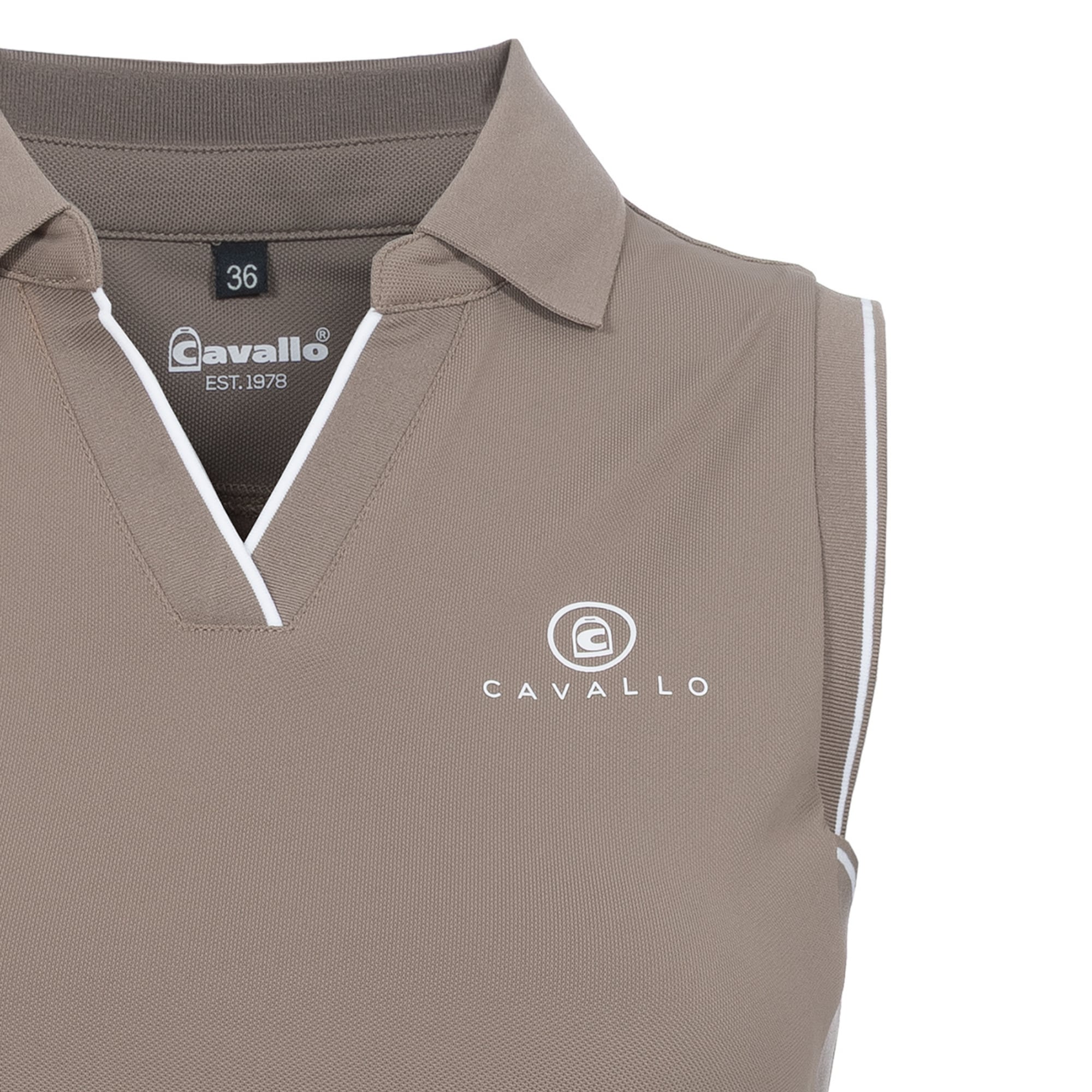 Cavalbua piké från Cavallo är en sportig ärmlös ridtröja i funktionell pikékvalitet, med ribbstickad krage samt ribbade avslut vid V-ringningen och ärmhålen, dekorerade med vita ränder. På vänster bröst finns en Cavallo-logga i vitt.