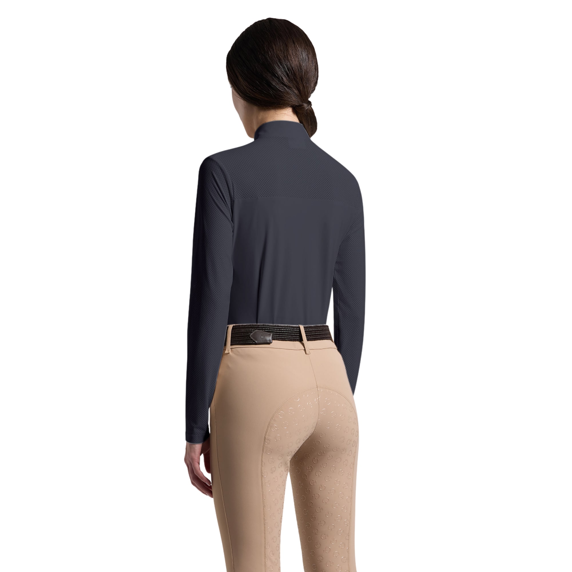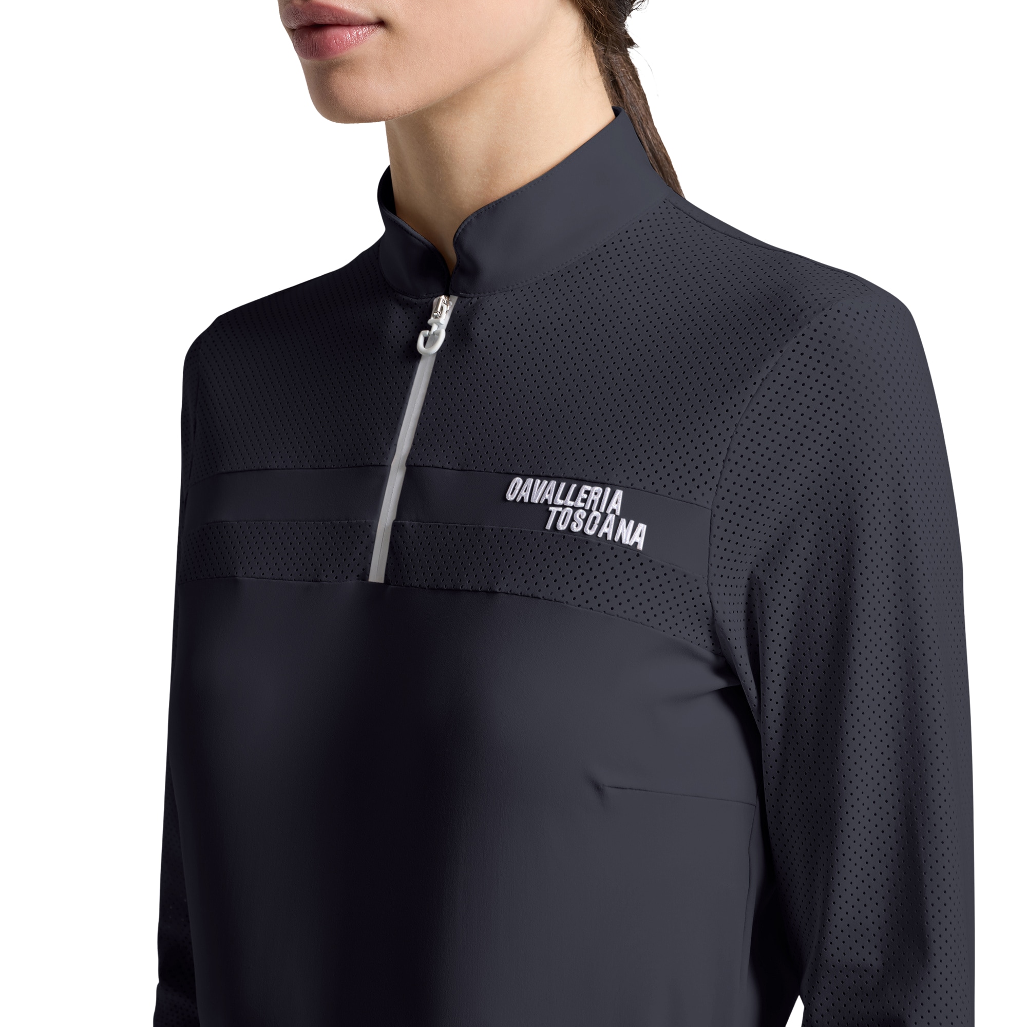 Ridtoppen är tillverkad i ett tekniskt material som håller dig sval och leder bort fukt under ridning. Perforerade partier över bröst, rygg och ärmar ger riktad ventilation där det behövs som mest, vilket bidrar till en jämn och behaglig temperatur.