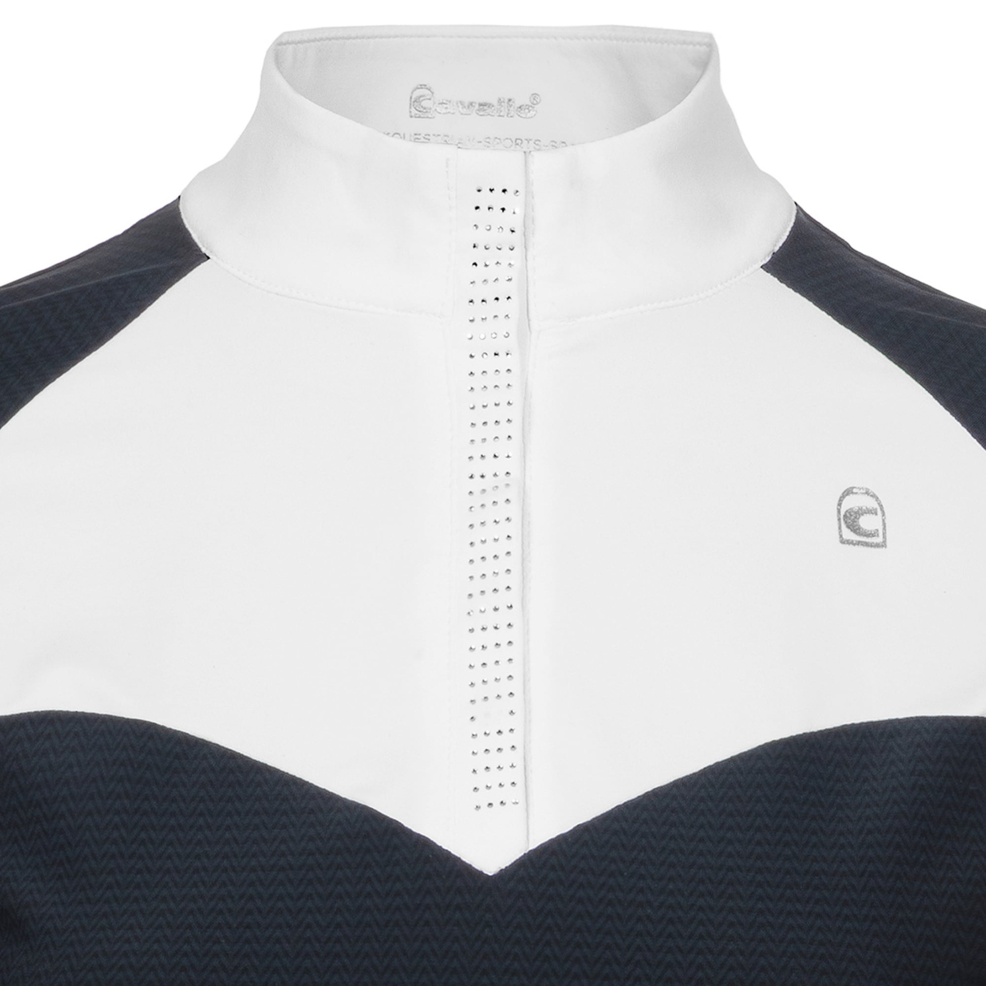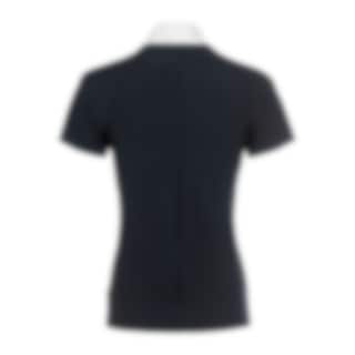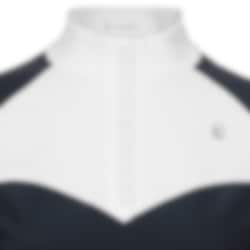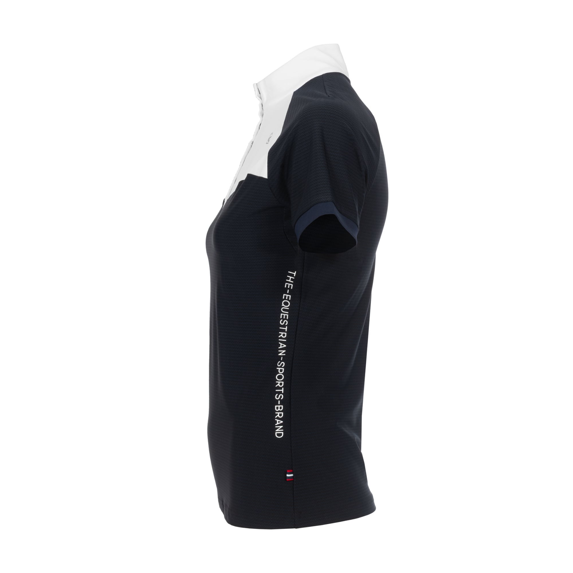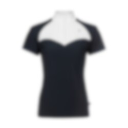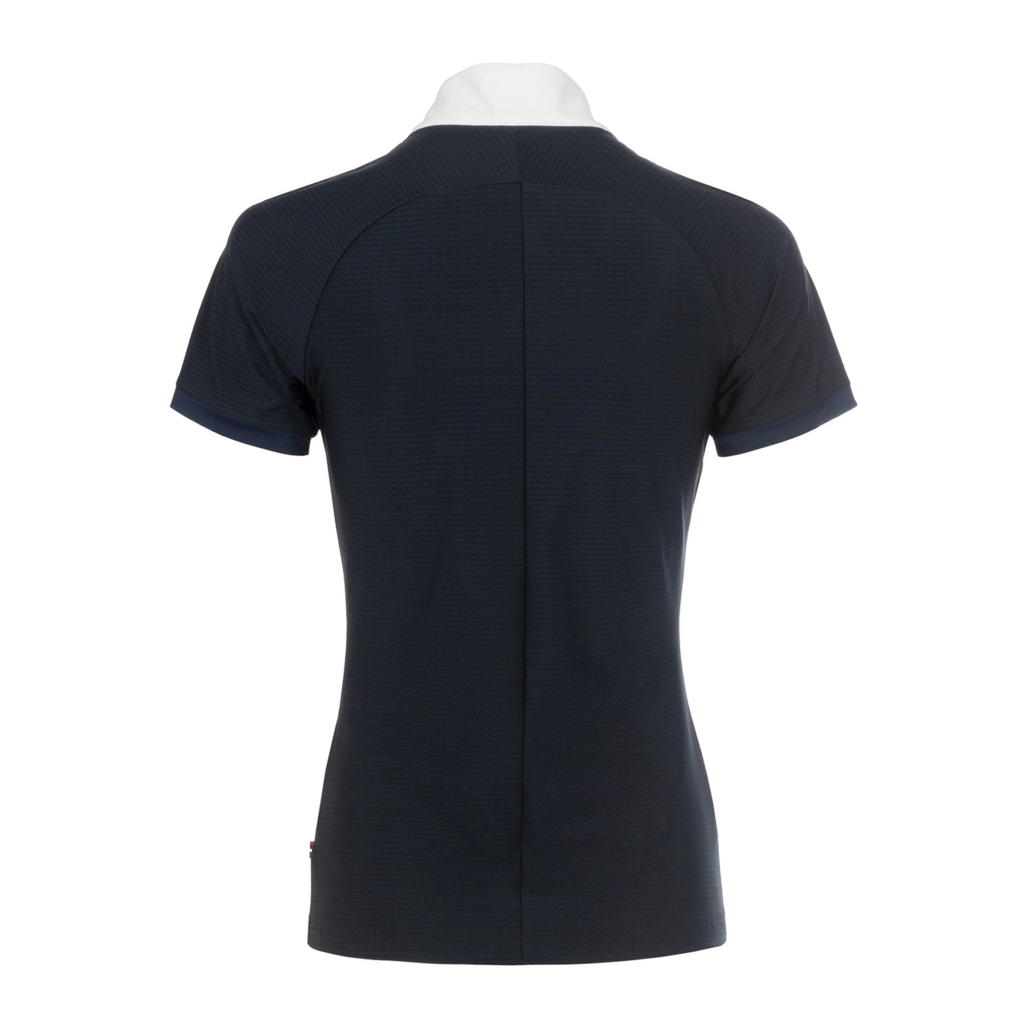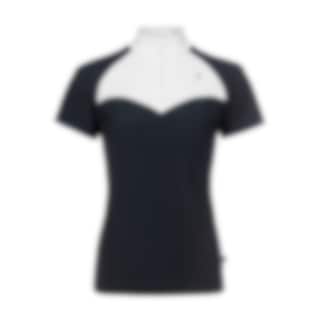 Tävlingsskjortan har kort ärm med mjuka jerseyärmslut med en knäppning framtill med dolda tryckknappar, dekorerad med kristallstenar medans det på vänster bröst finns ett Cavallo-print i silverstenar. Materialet är andningsbart, snabbtorkande och utvecklat för att vara odörneutralt.
